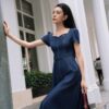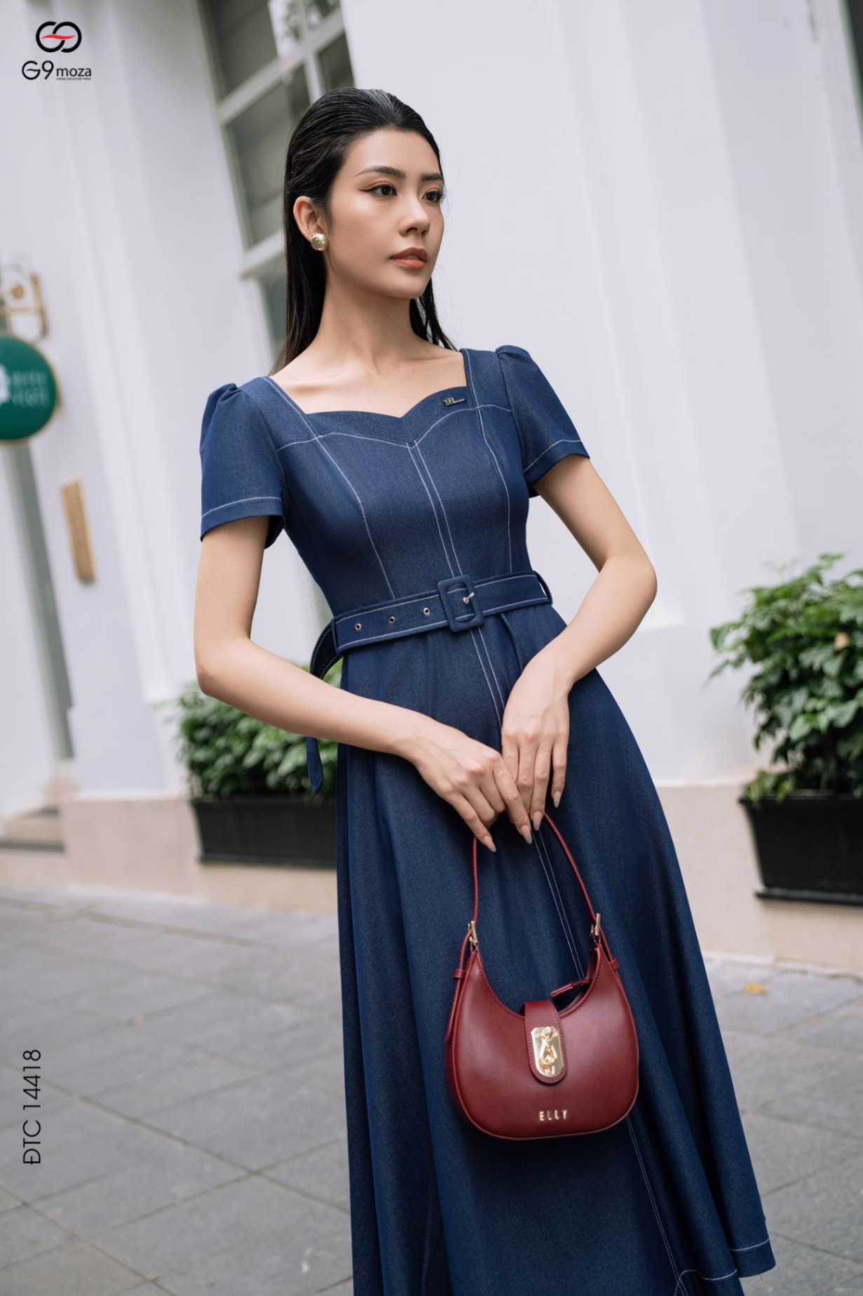 Đầm denim tay cộc dáng xòe kèm đai 25S16ĐTCX14418-1